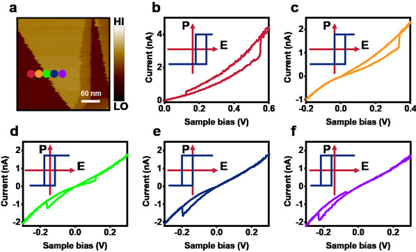 图2:a. 某个区域的原子力显微镜图。其中深色部分为高电阻态,浅色部分为低电阻态。图中圆点代表了b到f图曲线探测的位置。b-f. 取自a图中对应颜色点所在位置的电流电压曲线。相应的极化(P)和电场强度(E)的回滞曲线在插图中画出。