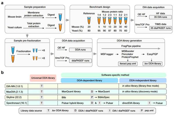 图1.该工作建立的标准DIA蛋白质组数据集以及评价的软件工具与谱图库组合