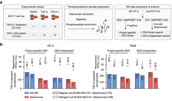 研究团队首先创建了代表常规蛋白质组学实验复杂性的标准数据集,利用该数据集评估了4种常用软件结合7种谱图库共10条数据分析流程的主要性能(图1),包括蛋白质组鉴定深度、参考谱图库质量对鉴定错误率和打分稳定性的影响、蛋白质组定量准确性和重复性,以及差异蛋白筛选的可靠性。然后利用一套合成磷酸化肽段的标注数据集评估了不同软件对磷酸化修饰位点定位的准确性,并提出了适用于不同软件算法的修饰位点定位打分阈值。最后通过建立实际样本的磷酸化蛋白质组数据集,比较了不同软件解析该数据的能力,揭示了不同数据分析流程在信号通路调控分析上的差异表现(图2)。