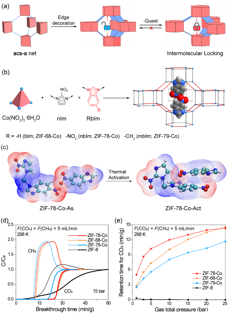 图2. 官能团诱导锁定策略构筑甲烷纯化ZIF材料:a,菱沸石(GME)网络的动态结构演化; b,混合配体策略构筑同网络系列钴基GME-ZIF化合物;c,活化前后单晶结构结合范德华表面静电势分析所得官能团诱导锁定的分子机制。d,高压多组分气体动态吸附穿透曲线;e,不同压力下的CO2保留时间。
