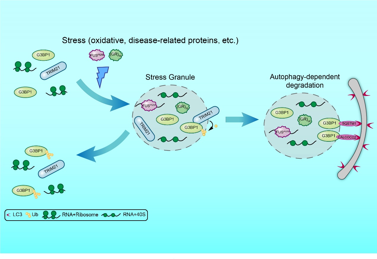 图1.TRIM21和自噬机制协同调节应激颗粒稳态的模式图。