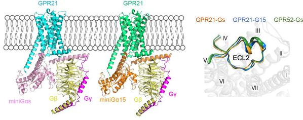图1.孤儿受体GPR21与下游G蛋白三聚体的复合物结构模型图(左);GPR21与GPR52的胞外环2(ECL2)的比较(右)。