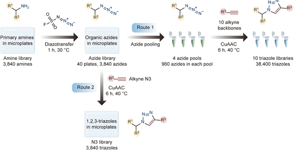 胰高血糖素样肽-1受体(GLP-1R))属于G蛋白偶联受体(G protein-coupled receptor, GPCR)家族,是治疗II型糖尿病和肥胖症的明星靶标。其天然肽激动剂的衍生物作为上市药物具有显著的降血糖、减体重的效果且副作用低,目前针对该靶标的小分子药物开发如火如荼,竞争激烈。为挖掘新的化学空间,水雯箐团队与其合作者独辟蹊径,利用双点击化学反应合成了10个结构全新的1,2,3-三氮唑库,从而对这个极具挑战的靶标开展配体筛选(图1)。