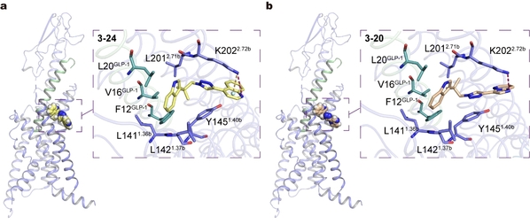 图2. 新配体3-24和3-20与GLP-1R的可能结合模式
