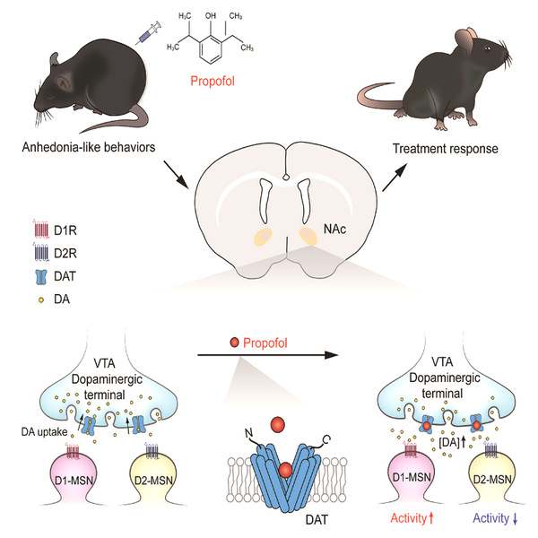 基于临床的观察提示,丙泊酚能有效提升部分心情不畅患者的情绪状态。研究团队因此进一步探索了丙泊酚的愉悦机制能否应用于抑郁症的干预。团队首先使用慢性束缚应激的动物模型以模拟抑郁症患者的日常心理压力,发现慢性应激动物出现了显著的快感缺失(对糖水偏好下降)的行为表现。令人振奋的是,单针丙泊酚注射即可在4小时后逆转快感缺失这一行为表型,并持续到24小时和3天以上的时间点中。如采用神经环路抑制的技术,降低丙泊酚暴露后多巴胺1型受体神经元的电活动,则丙泊酚的抗快感缺失效果消失。这些证据指出,丙泊酚可通过特定分子结合模式,调控奖赏中枢多巴胺水平,对抗快感缺失。