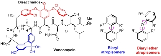 轴手性阻转异构体是一种由于σ键的受限旋转而引起的立体异构体,在天然产物、药物分子以及手性催化剂中广泛存在。如在著名的抗生素万古霉素(Vancomycin)中,就同时存在一个联芳基阻旋异构和两个二芳基醚阻旋异构(图1)。相较于较为常见的联芳基阻旋异构体,二芳基醚阻旋异构体具有独特的双轴结构,近年来,阻转异构体的不对称合成受到有机化学家的广泛关注,但对于轴手性二芳基醚的催化不对称合成方面的研究鲜见报道,这是因为同时构建空间拥挤的二芳基醚结构以及实现其更为柔性的双轴手性结构的立体选择性控制都存在巨大的挑战性。之前的研究都局限于某一特定类型的底物结构,因此发展基于新的结构类型的、同时可以实现轴手性二芳基醚高效催化不对称合成的新方法是非常有意义的。