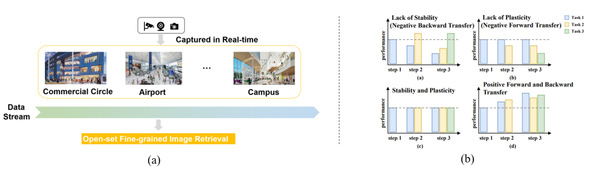 行人再识别终身学习是面向现实场景的一种学习范式,期望能够不断处理在不同时间段、不同地点采集到的连续且非平稳分布的行人再识别信息流。在这种学习范式下,模型在每个训练阶段只能见到当前任务的训练数据。与传统的终身学习相比,在终身学习场景下开展的开集细粒度图像检索问题,其挑战在于如何有效保存旧知识并逐步增加新的识别能力。目前的多数方法都在解决模型的灾难性遗忘问题,缺乏对旧知识的优化和整合。