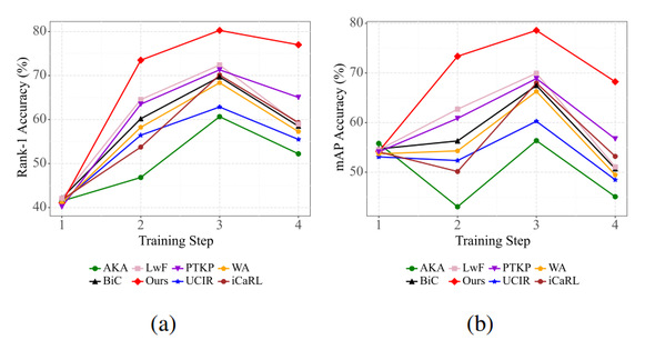 图 :(a) 行人再识别终身学习流程示意图 ;(b) 不同终身学习方法效果对比