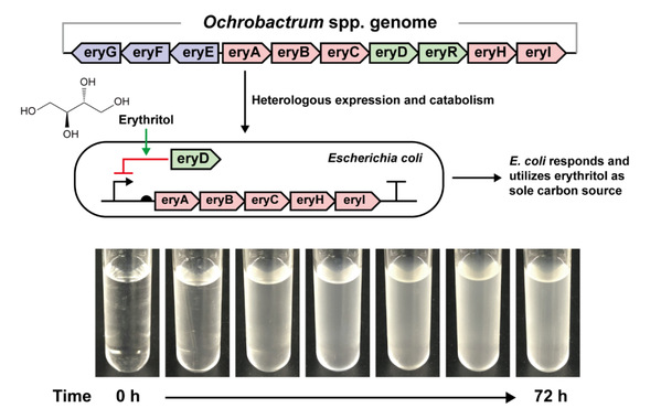 研究人员首先从自然环境中分离出能够分解赤藓糖醇的代谢通路,然后将该通路(即五个酶蛋白eryA、eryB、eryC、eryH、eryI)引入模式大肠杆菌MG1655体内,使其能够在合成培养基中以赤藓糖醇为唯一碳源进行生长。通过转录组分析与代谢通路改造,研究人员进一步提升了该菌株代谢赤藓糖醇的能力,经连续培养后的菌群密度接近以葡萄糖为碳源时的菌群密度。此外,本研究还首次鉴定了响应赤藓糖醇的转录调控蛋白eryD及其DNA结合序列,并将此元件成功拓展运用到其他基因线路中,构建出多种可受赤藓糖醇调控的合成基因线路,显示其在合成生物学领域的应用前景。
