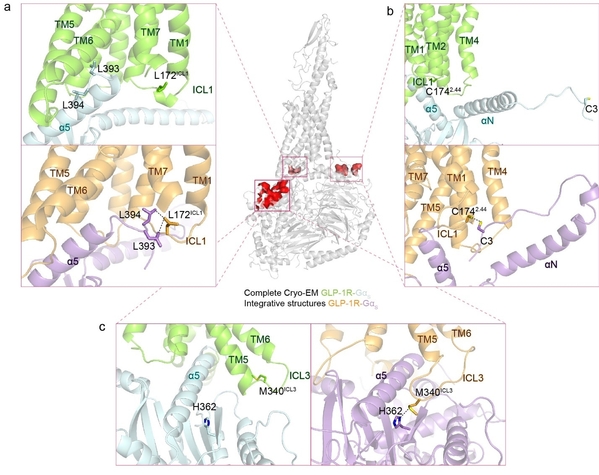 与该复合物的冷冻电镜结构相比,这一整合结构模型群体展现出显著不同的特征,结构差异主要存在于受体与G蛋白相互作用界面与G蛋白异源三聚体内部,反映出溶液中该复合物高度的构象多样性。研究团队验证了仅在整合结构模型中观测到的24对受体与G蛋白的互作位点对,在这些互作界面上位点的突变能够显著削弱受体介导的细胞信号转导,此结果支持了区别于电镜结构的复合物功能态构象的存在(图1)。本工作将为不同种类GPCR的构象动态性研究提供新思路与新方法,从而推动基于GPCR非经典构象的药物设计。