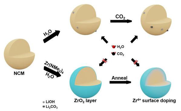 图2. ZrO2包覆与Zr4+表面掺杂阻止NCM在储存时失效的示意图