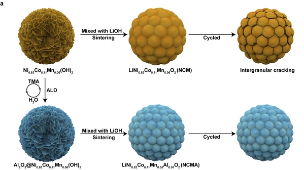 图1. NCMA颗粒的合成过程及晶粒细化示意图。原子层沉积过程导致在氢氧化物前驱体上形成氧化铝薄膜,从而在后续锂化过程中细化一次颗粒。