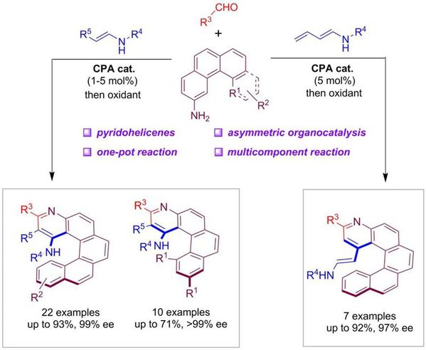 螺烯是一类由多个芳环邻位稠和而成的多环芳香化合物,由于其独特的螺旋手性以及刚性的π-共轭多环芳烃结构,手性螺烯在不对称催化、手性材料科学以及分子机器等众多领域中均有着广泛应用。相较于过渡金属催化,不对称有机小分子催化在绿色环保、官能团兼容性等方面具有优势,且催化不对称多组分反应可快速、多样化地合成具有结构多样性和复杂性的手性化合物,但目前发展的催化对映选择性合成手性螺烯的方法仍受限于单分子及双分子反应,催化不对称多组分反应在螺烯不对称合成中的应用尚未见报道。基于对具有非传统手性元素分子的不对称催化合成兴趣,杨晓瑜课题组近期利用手性磷酸催化下的三组分连续Povarov环化和氧化芳构化过程,以优异的对映选择性实现了一系列含有吡啶氮杂螺烯的不对称合成。(图1)。