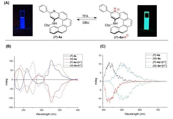 图2. 酸-碱调控手性氮杂螺烯光物理及手性光学性质转化