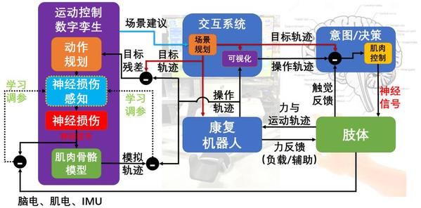 脑卒中导致的运动障碍可通过复健训练得以部分康复。传统的脑卒中复健流程中,病人的状态评估、病人的积极性评估以及康复任务的动态选取全部依赖康复师的经验,不利于脑卒中康复的普及以及康复效率。江智浩课题组与上海卓道医疗科技有限公司合作,提出基于运动控制数字孪生的智能机器人康复辅助系统。通过康复机器人采集病人康复任务表现,推断病人运动控制参数与状态,识别出病人神经损伤的部位以及程度,并据此设定康复任务,提升康复效率。