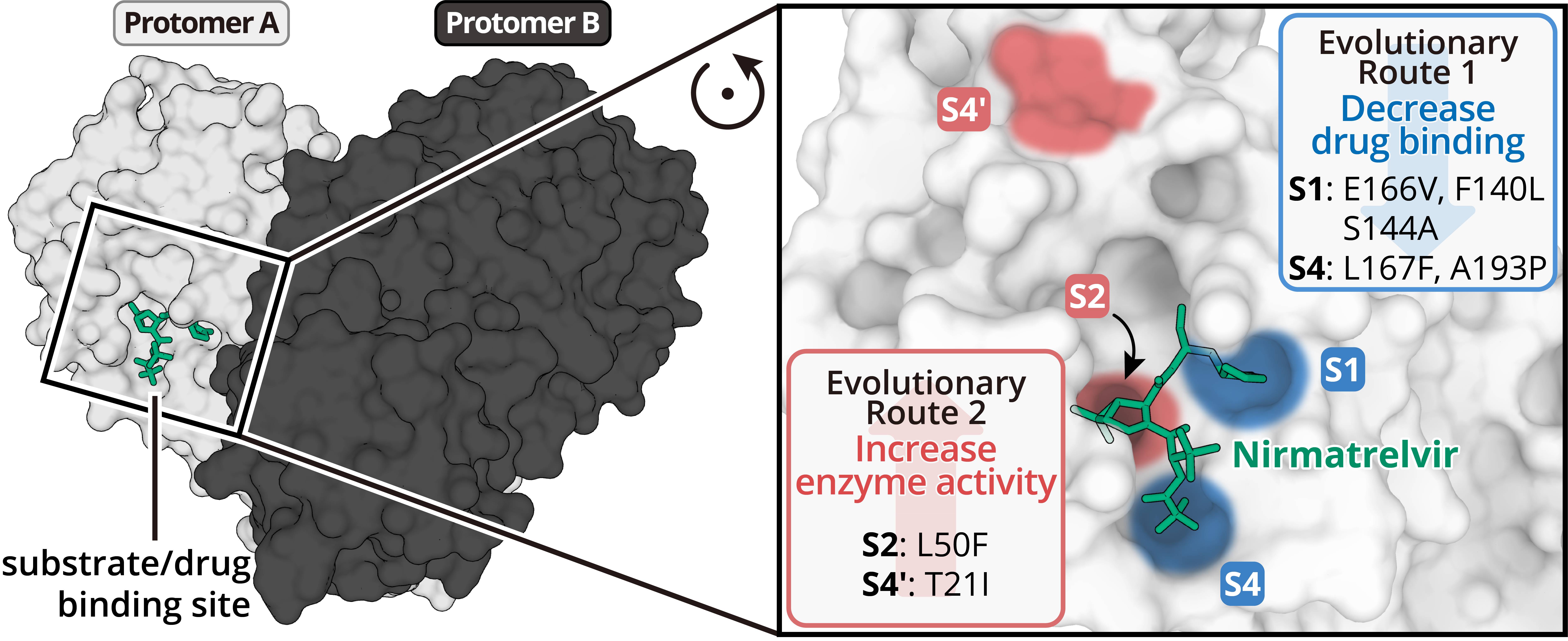 研究团队曾发现,在奈玛特韦的选择压力作用下,新冠病毒可以通过突变其主蛋白酶上的多个位点获得对奈玛特韦的耐药性,但其背后的精确分子机制仍是未解之谜(Iketani et al., Nature, 2022)。利用病毒主蛋白酶的结构对突变位点进行分析发现,耐药突变E166V、F140L和S144A位于主蛋白酶底物识别口袋的S1位点,L50F突变在S2位点附近,L167F和A193P突变在S4位点,而T21I突变位于S4'位点。综合利用病毒学、生物化学以及结构生物学等多学科交叉手段对以上突变展开研究,本工作首次发现了新冠病毒可以利用两种截然不同的进化途径(如图所示:Evolutionary Routes 1 & 2)对奈玛特韦产生耐药性。