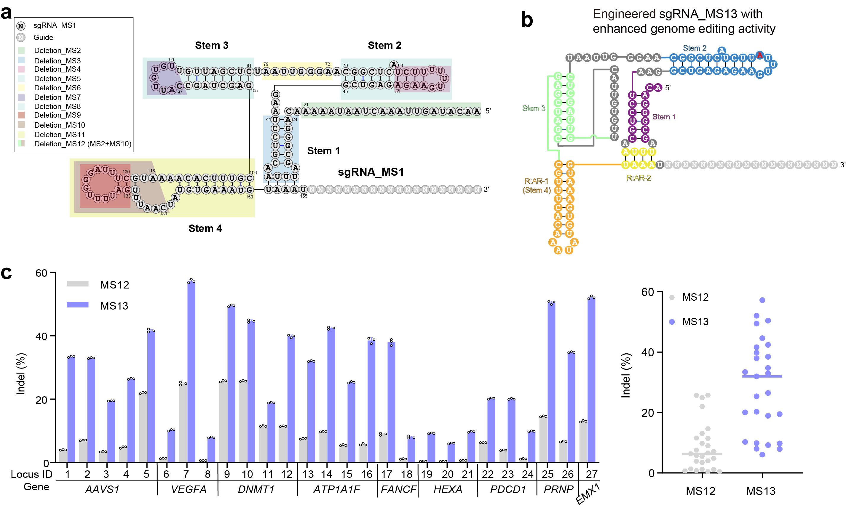 为了获得体内活性,研究人员通过优化引导RNA的结构,设计了一个在细菌内具有高活性的单向导RNA(sgRNA_MS1)。进一步对CnCas12f1的sgRNA进行系统工程化设计,最终获得了在人类细胞中表达更高、编辑活性大幅提升的sgRNA_MS13。这同时也表明引导RNA的结构缺陷是限制Cas12f家族核酸酶基因组编辑活性的主要因素。
