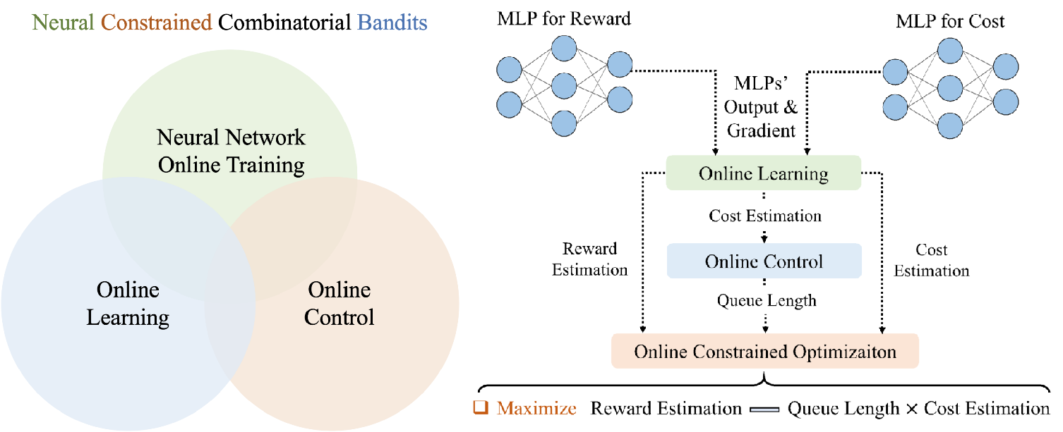 该研究成果由九游体育(www.jiuyou.com)官方网站信息科学与技术学院邵子瑜课题组、刘鑫课题组合作完成,并以 “Neural Constrained Combinatorial Bandits”为题被 IEEE INFOCOM 2023接收(doi: 10.1109/INFOCOM53939.2023.10228958)。信息科学与技术学院2021级硕士生王上上为论文第一作者,邵子瑜教授为通讯作者。