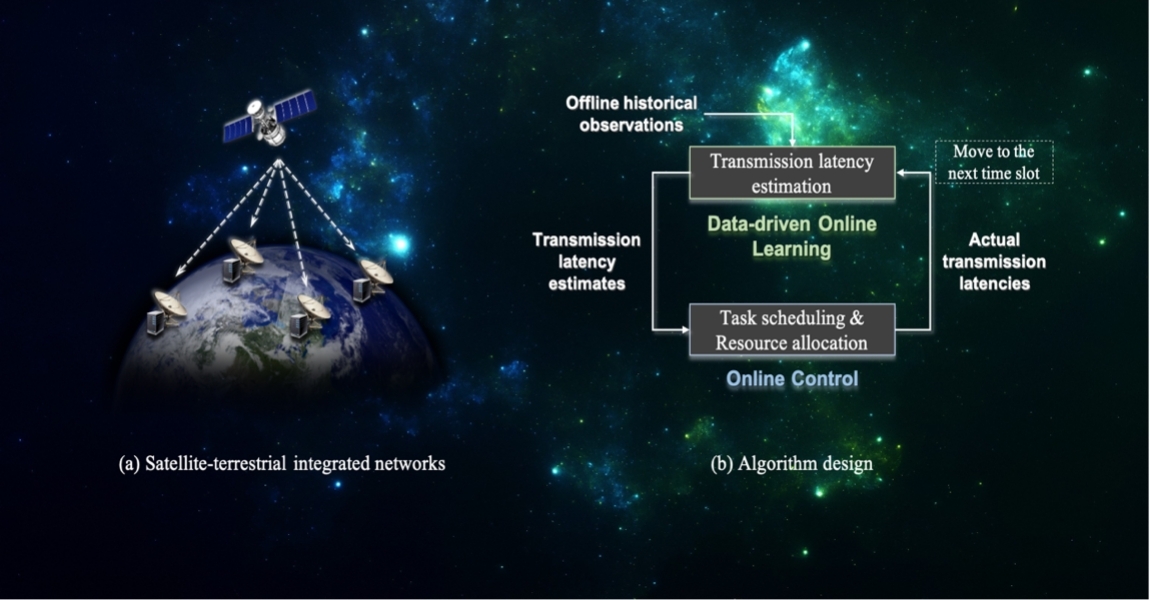 随着科学研究对结合太空观测和地面处理分析的需求高涨,基于星地融合智能网络的泛在科学智能系统随之迅速发展。为了在满足系统能耗约束的前提下最小化任务处理时延,需要合理地在卫星和地面之间进行任务调度和系统资源分配。然而,星地之间传输时延难以实时观测,且需要考虑能耗和时延之间的权衡,使得该问题变得极具挑战性。邵子瑜课题组基于在线控制和在线学习相结合的方法,利用离线历史数据来加速学习过程,提出了一个分布式的智能任务调度和资源分配算法。理论分析与仿真实验验证了所提出算法的有效性和优越性。该成果能够有效促进泛在科学智能的发展,可进一步扩充至空天地海一体化智能网络以及基于卫星网络的天基算力系统,并在未来民用卫星领域(如手机卫星通信等)具有广阔的应用前景。