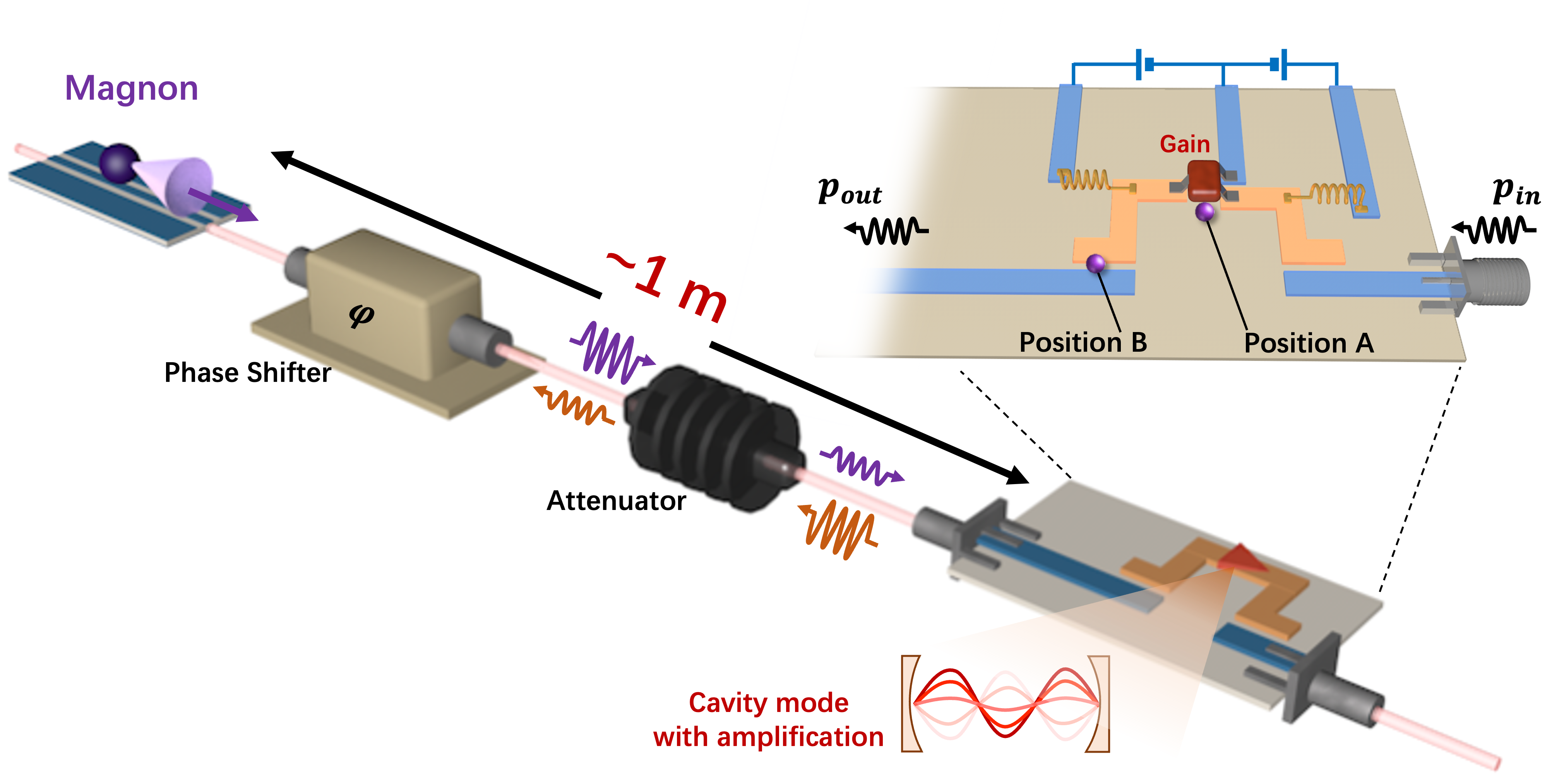 图3:光子-磁振子长程强耦合实验装置图。磁性小球中的磁振子模式(左上角)经过微波线缆、移相器和衰减器后与有源平面谐振腔(右下角)连接。移相器和衰减器用于调控线缆中的电磁行波,进而实现切换光子-磁振子耦合状态和控制耦合强度。