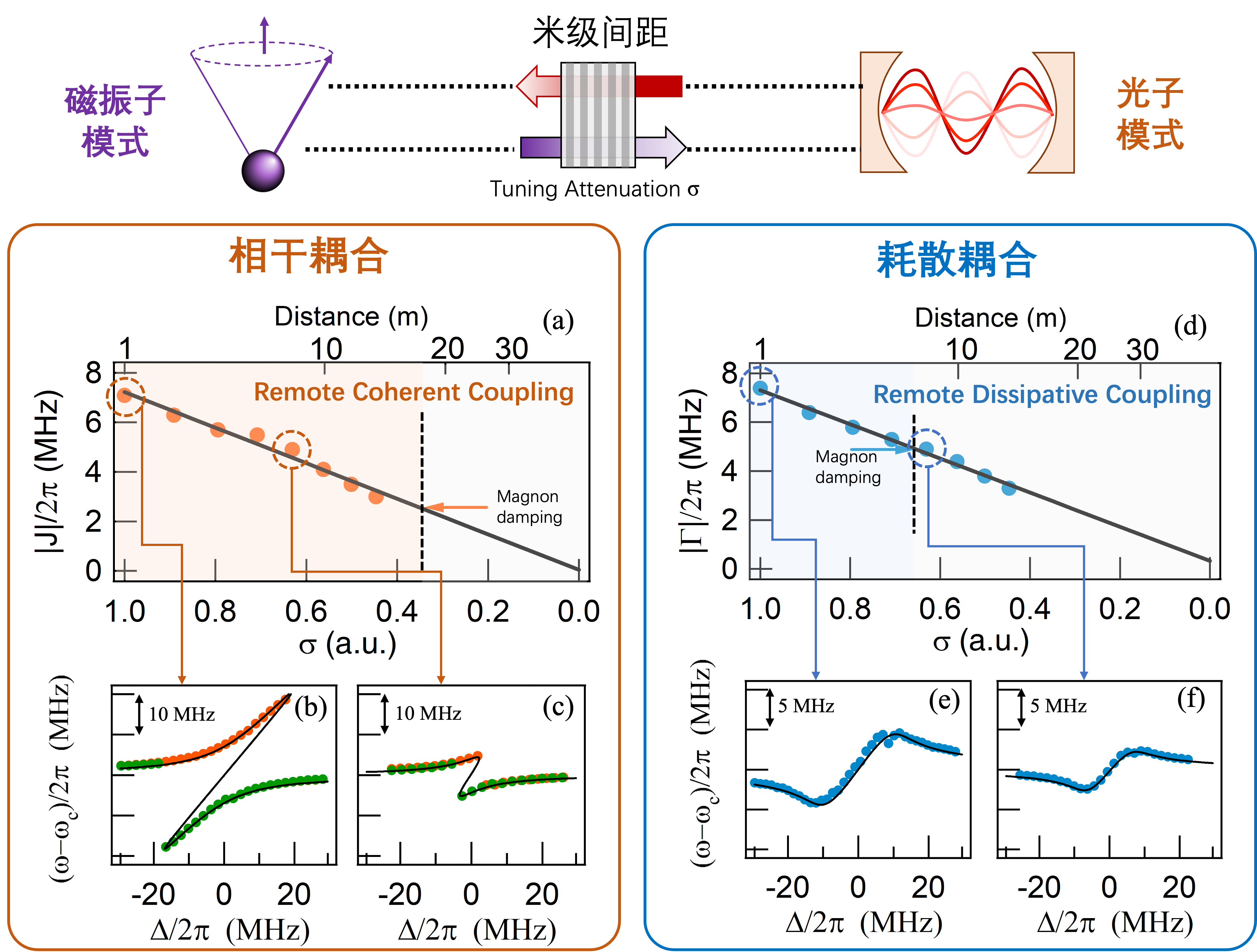 图4:光子-磁振子长程强耦合实验结果。上图:长程耦合系统示意图。左下:光子-磁振子相干耦合效应。降低波导中电磁行波的透射率σ,相干耦合强度|J|/2π呈线性降低。右下:光子-磁振子耗散耦合效应。耗散耦合强度|г|/2π同样可以被电磁行波透射率精确调控。