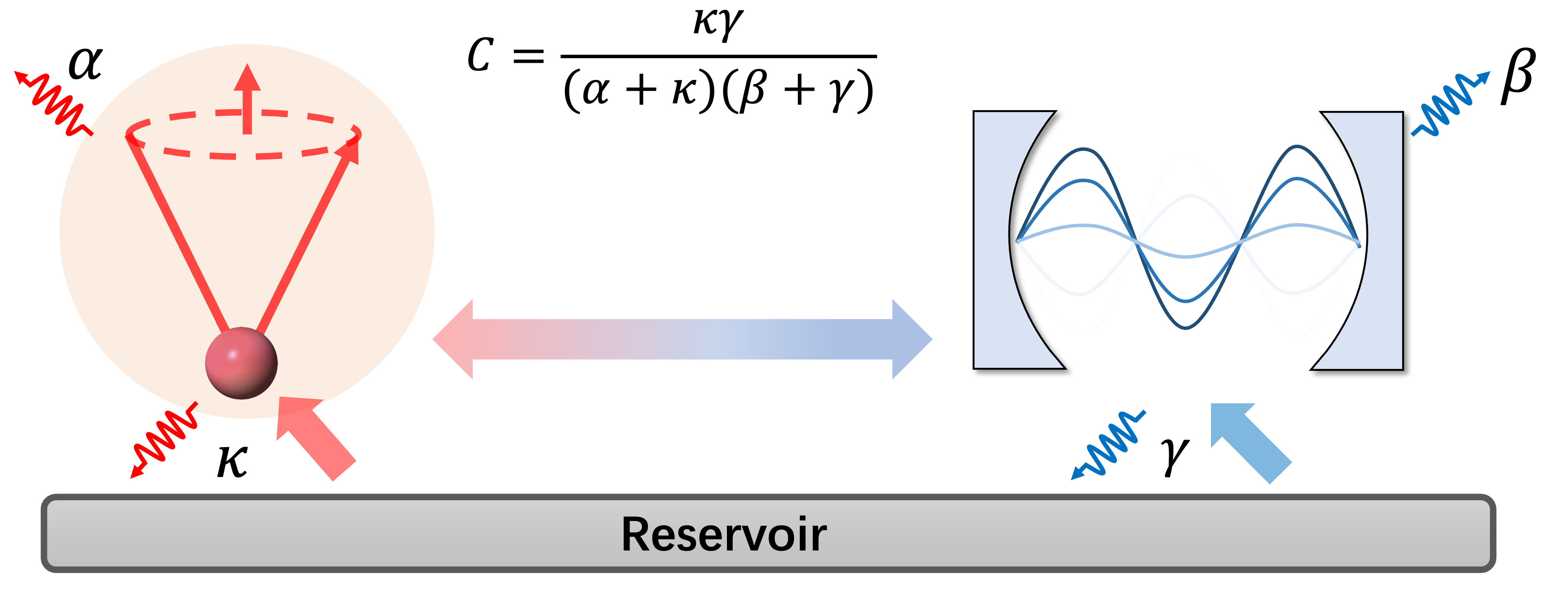 图2:长程相互作用示意图。磁性材料中的磁振子模式(红色部分)与微波谐振腔中的光子模式(蓝色部分)通过电磁行波(图中Reservoir部分)产生间接耦合。α,κ,β和γ分别表示磁振子和光子模式的本征阻尼,以及它们向电磁行波中的能量耗散速率。两个模式的耦合协同效率C始终小于1,因此长程强耦合理论上难以实现。