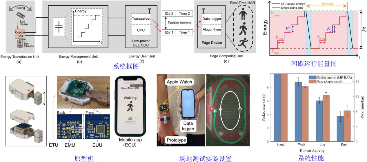 研究团队开发的一种运动供能的实时人体活动识别(HAR)系统,可根据人体手臂摆动频率与产生能量之间对应的数学关系,将能量和信息有机结合,在收集运动能量的同时提取基本的运动信息,再利用收集的能量驱动蓝牙芯片将运动信息无线发射出去,具有低功耗和低成本的特点和优势。实验室和场地测试表明,该系统能可靠识别不同的人体活动,如站立、行走、慢跑和快跑,为泛在人体活动识别带来了一种简约有效的解决方案。
