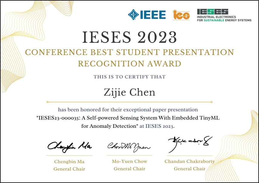 相关工作在动能收集和工业电子等领域的国际会议上亦获得了学术同行好评。会议海报在第四届振动与能量收集应用国际会议(The 4th International Conference on Vibration and Energy Harvesting Applications)上获“最佳海报奖”;第一作者陈梓杰同学在第三届IEEE工业电子和可持续能源系统国际会议(The 3rd IEEE International Conference on Industrial Electronics for Sustainable Energy Systems)上获“最佳学生报告奖”。