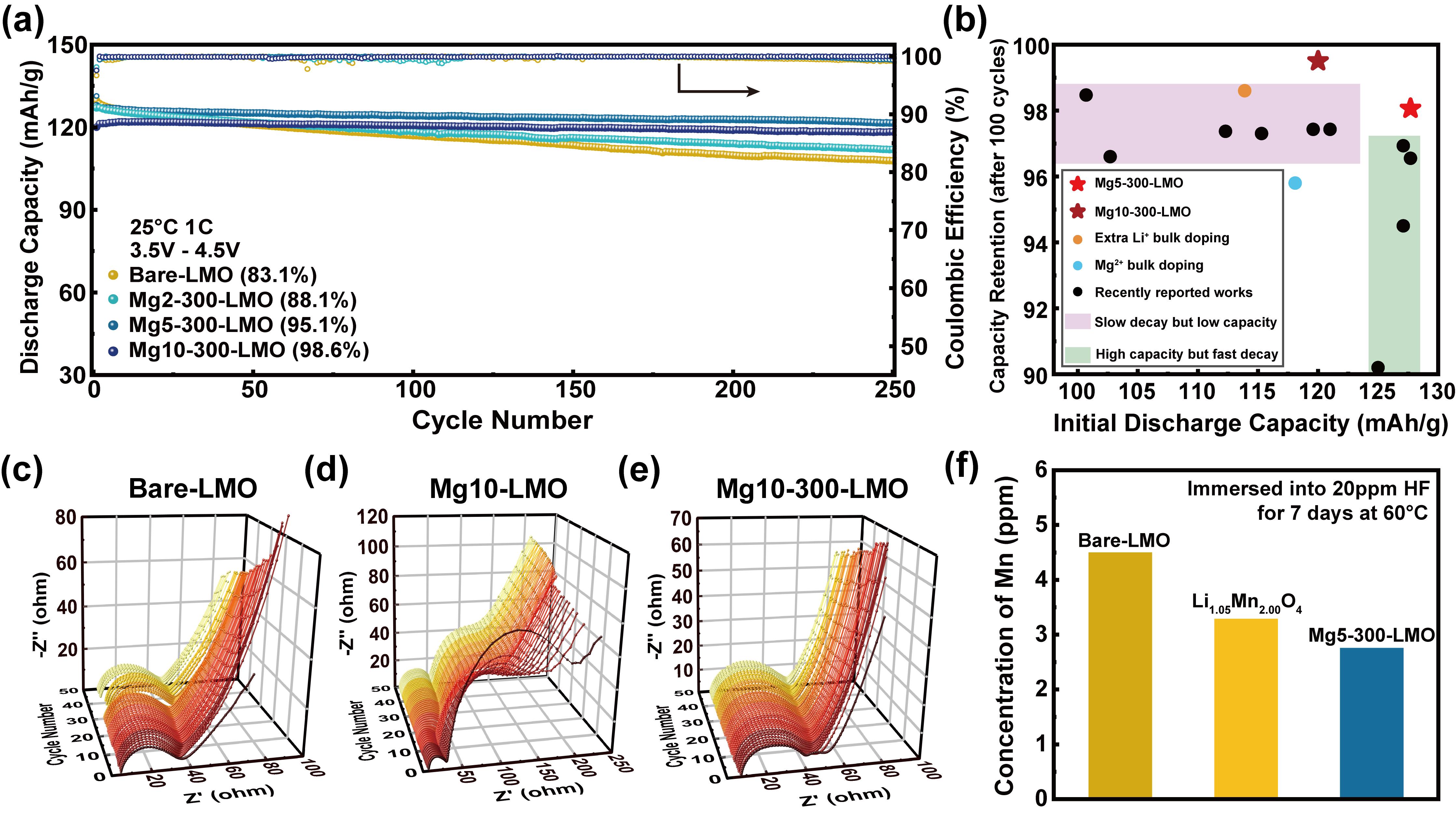 图1. 表面镁离子改性后的循环性能、电化学阻抗测试与抑制锰溶出表现