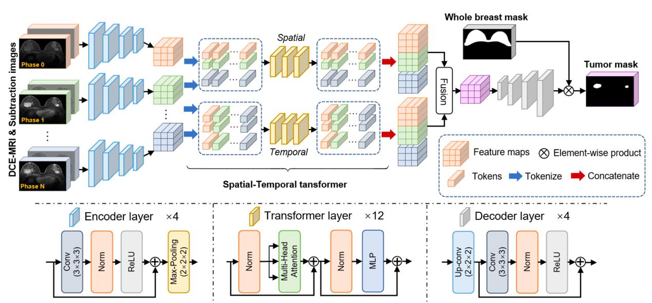 利用动态对比度增强磁共振 (Dynamic-Contrast Enhancement MRI, DCE-MRI) 技术,有助于及早发现乳腺癌。在临床上通常从 DCE-MRI 中分割乳腺肿瘤,辅助诊断和制定治疗方案。目前基于人工智能的自动分割研究都集中于单对比度的肿瘤分割方法,忽视了多期影像间的时序信息,因此分割结果不尽人意。