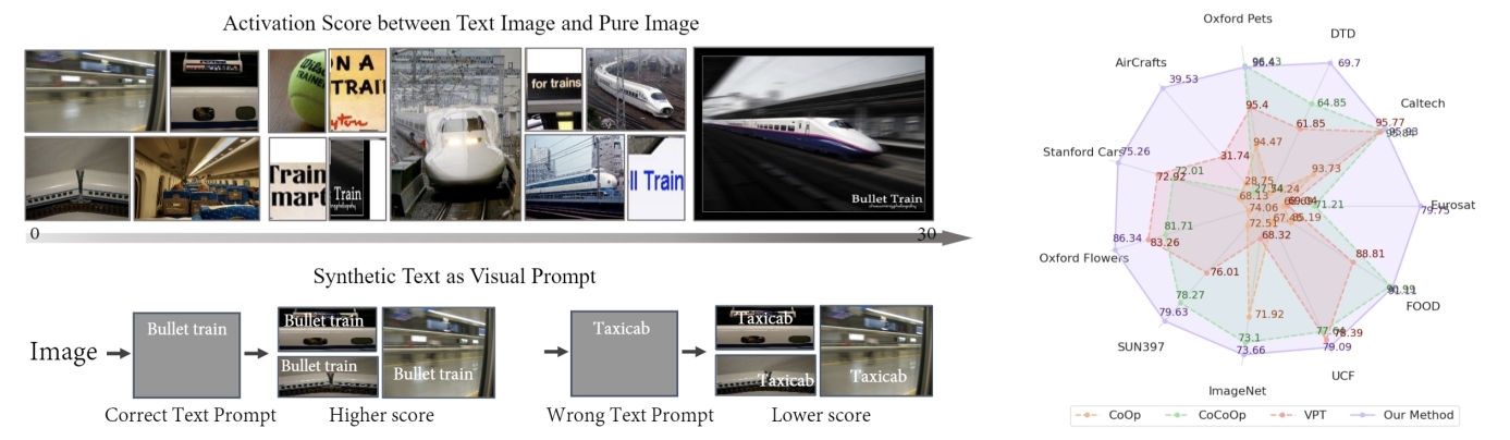 如何利用大规模预训练视觉-语言模型一直是视觉-语言领域研究中棘手的问题,之前的主流方法主要研究如何从可学习的Text Prompt在少样本任务下取得性能提升,缺乏视觉分支的研究。研究人员发现合成的文本图像具有激活大规模预训练视觉-语言模型的视觉感知能力,并提出了一种新颖的视觉提示词方法,在10多个下游数据集和不同的任务设定中均显著超越之前方法。审稿人一致认为该策略极具创新性和启发性。