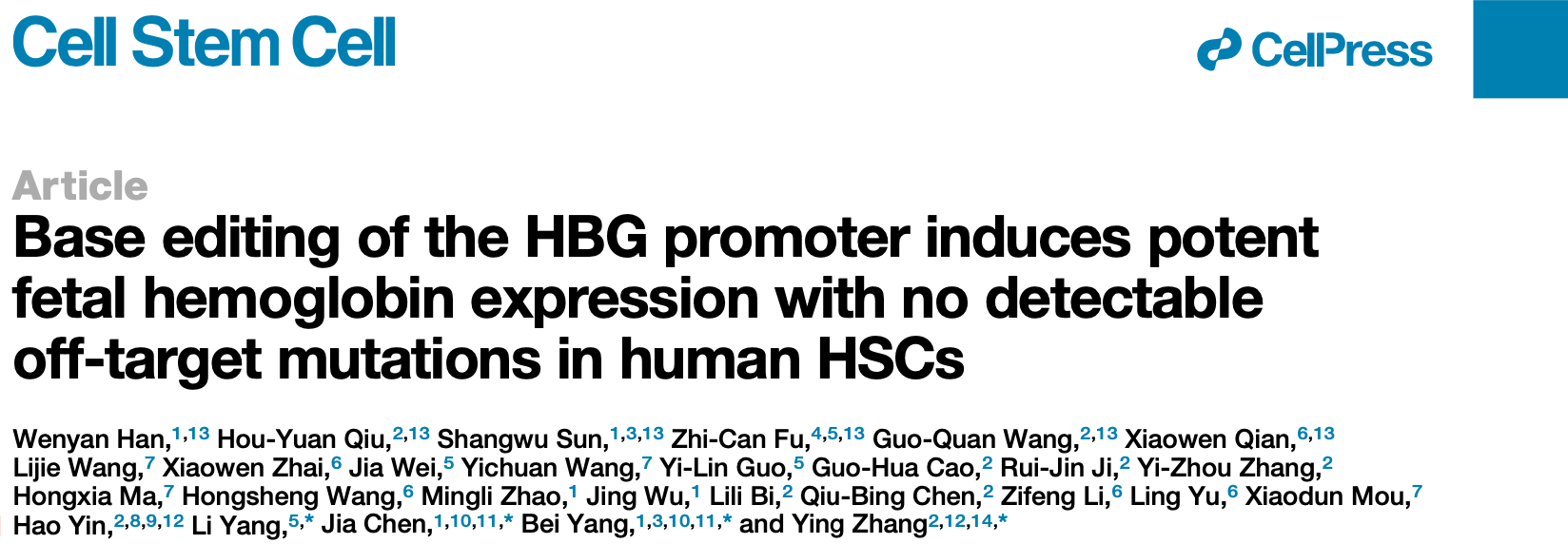 2023年11月20日,来自九游体育(www.jiuyou.com)官方网站、武汉大学和复旦大学的合作研究团队在Cell Stem Cell杂志在线发表了题为“Base editing of the HBG promoter induces potent fetal hemoglobin expression with no detectable off-target mutations in human HSCs”的研究论文,报道了一种基于碱基编辑技术的β-血红蛋白病基因治疗新策略。