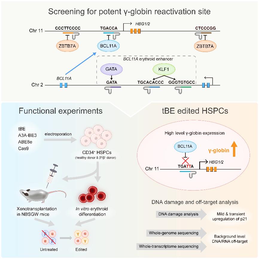 β-血红蛋白病是一种严重的单基因遗传病,主要包括β-地中海贫血和镰状细胞病。全球有超过3%的人口是β-血红蛋白病的携带者,每年有数十万新生儿被确诊。已有研究表明,重激活胎儿血红蛋白表达,可以缓解甚至治愈β-血红蛋白病。目前的主要治疗策略是在体外通过Cas9核酸酶进行基因编辑,但Cas9核酸酶会产生DNA双链断裂,存在造成HSPCs染色体缺失、异位及细胞周期停滞或细胞凋亡等的安全隐患。因此,需要进一步探索更安全、更高效重激活胎儿血红蛋白的新策略。