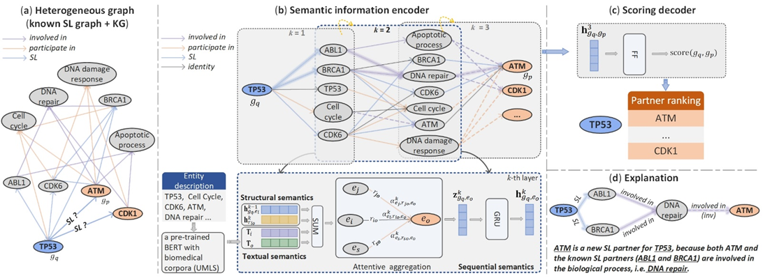 图:KR4SL模型。(a) 整合已有的SL关系和知识图谱构建新的异构图。(b)上图表示为给定基因搜索关系有向图并找到可能的候选SL伙伴基因。下图表示整合三种信息并利用注意力机制聚合消息。(c)根据基因对的表示为候选基因打分。(d)关系路径解释预测过程和潜在合成致死机制。