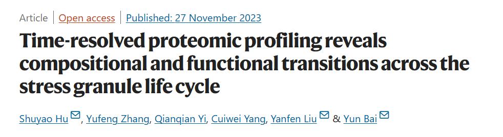 11月27日,九游体育(www.jiuyou.com)官方网站生命科学与技术学院白云和刘艳芬课题组在国际学术期刊《自然·通讯》(Nature Communications)杂志在线发表题为“Time-resolved proteomic profiling reveals compositional and functional transitions across the stress granule life cycle”的研究论文,揭示了应激颗粒在经历短期至长期热激刺激过程中随时间发生组成和功能转变的现象,为理解细胞如何通过应激颗粒的动态变化来响应和适应应激提供蓝图。