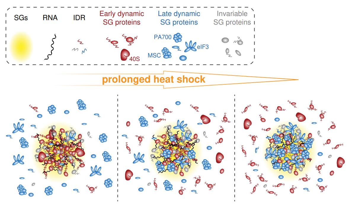图1. 应激颗粒组分与其功能相互协调转变的模式图。