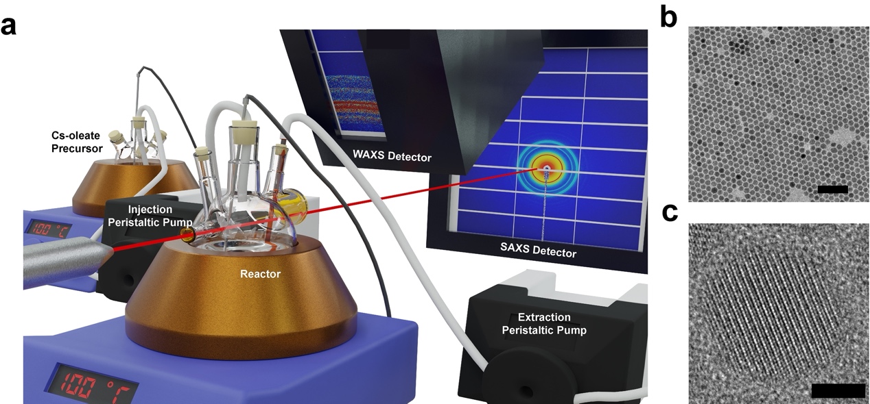 图1:原位合成装置的同步辐射实验布局和钙钛矿量子点的电镜图。