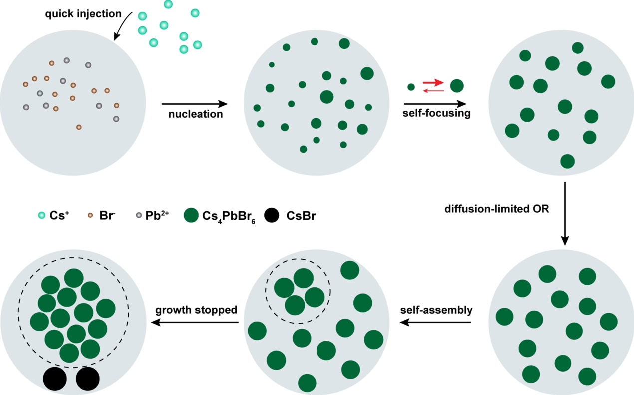 全无机铯铅卤化物钙钛矿纳米晶体(CsPbX3)具有卓越的光学和电学性能,被广泛应用于太阳能电池、激光器、发光二极管、光电探测器和晶体管等领域。近期,CsPbX3钙钛矿的零维衍生物Cs4PbX6因其优异的光学性能而引起广泛关注,Cs4PbX6能够转化成CsPbX3,为合成特定钙钛矿量子点开辟新途径,也可以用于防伪和湿度传感器等应用领域。虽然人们在Cs4PbX6纳米晶体合成方法方面取得了一些进展,可以实现晶体尺寸和形状可调,但由于极快的生长过程,其内在生长机理仍然未知。