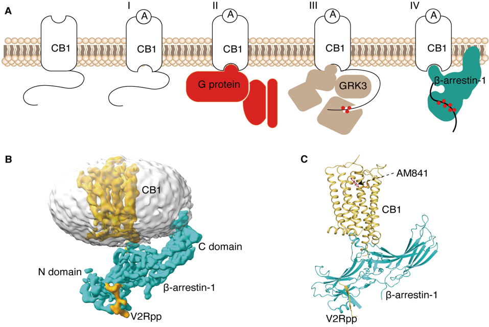 图2. 大麻素受体CB1与β-arrestin-1的复合物三维结构
