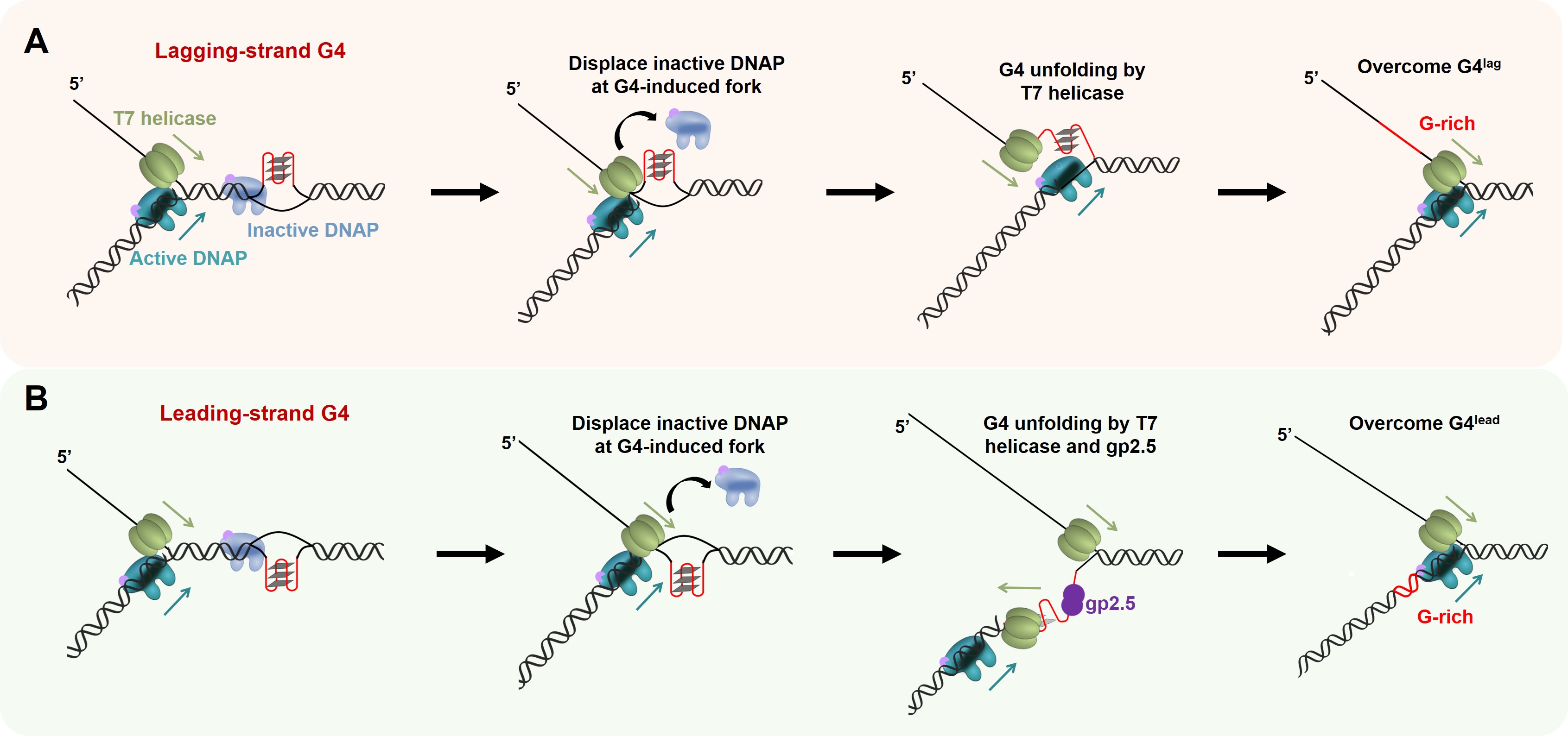 图1:T7复制体复制G4的分子机制模型图。A. 滞后链含有G4结构时,T7解旋酶移除结合在叉状结构处非活性的T7 DNAP并且解链滞后链的G4结构,帮助T7 DNAP克服障碍。B. 前导链含有G4结构时,T7解旋酶与gp2.5协同工作,协助T7 DNAP克服G4完成复制。