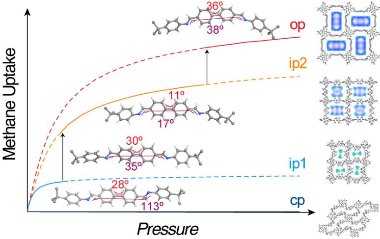 高压甲烷吸附测试表明,这种独特的COF旋转异构体结构转变在甲烷吸附过程中表现出多阶分步吸附,从而实现了高的甲烷存储工作容量。理论计算发现在吸附过程中不断打开的孔道不仅提供了更大的孔容,同时增大的孔道内表面提供了更多的甲烷吸附位点(图2)。