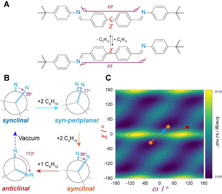DynaCOF是新一代的柔性多孔晶体,是研究客体控制功能有机分子构象和物化性质的研究平台。前期,课题组已经在客体依赖的动态响应、分子自适应传感、对称性破缺和能带调控和按需调控柔性等取得了系列进展。该工作通过在有机单体中引入可旋转的单键(图1A)赋予dynaCOF更多的运动自由度并定义描述结构的参数苯环间的扭角和双亚胺键的扭角;利用正丁烷作为探针分子,结合冷冻三维电子衍射和准原位同步辐射粉末衍射技术,原子级观察到客体分子化学计量比吸附诱导的结构多级相变,同时结构单元构象由synclinal(顺错)变化为syn-periplanar(顺叠)(吸附2倍当量丁烷),synclinal(顺错)(吸附4倍当量丁烷)以及anticlinal(反错)(吸附5倍当量丁烷,图1B);通过对结构单元所有构象的旋转异构体自由能统计,绘制了该COF结构相变的能量变化路径(图1C)。