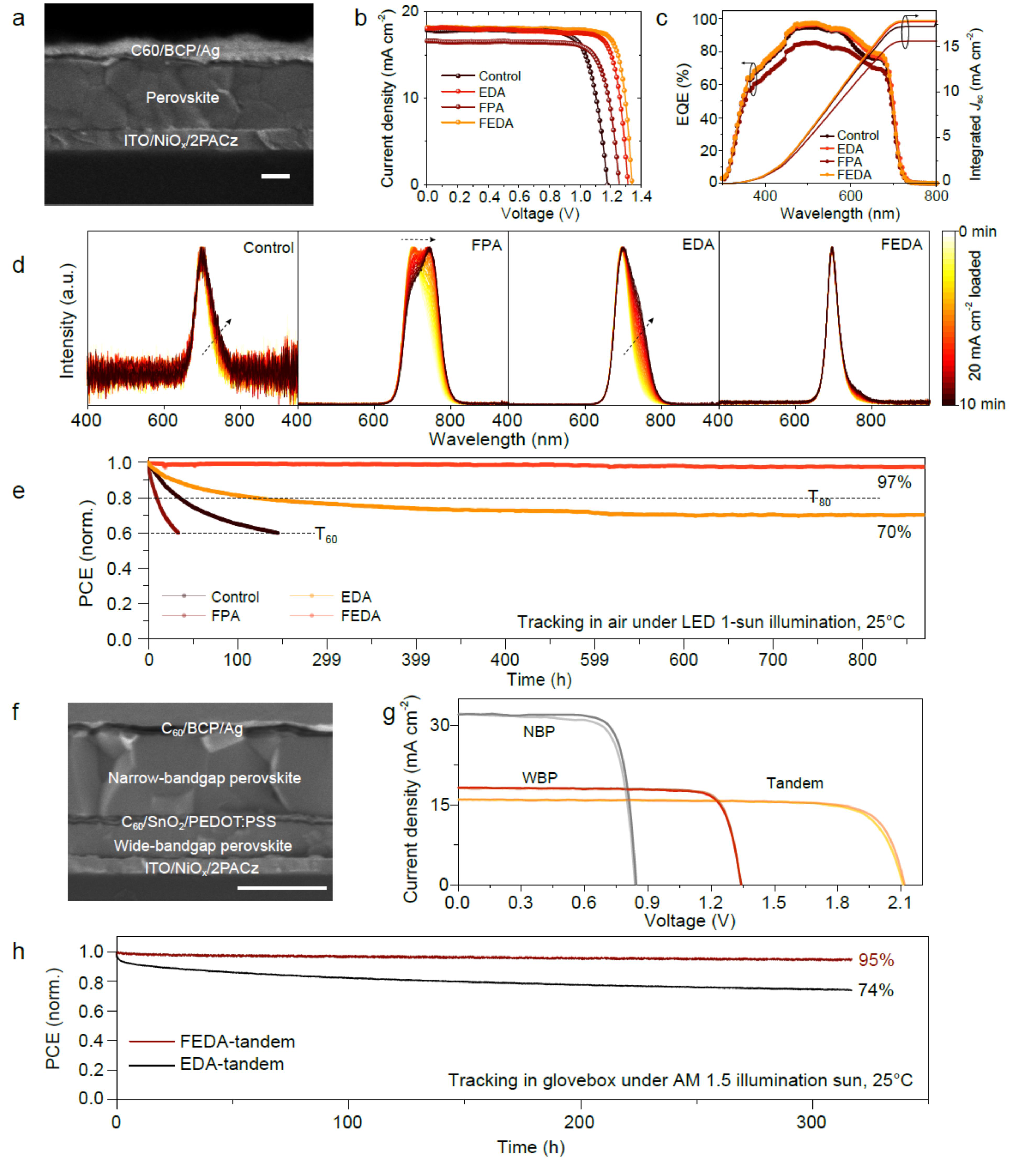 通过三维-低维异质结结构有效提升了反式结构宽带隙钙钛矿太阳能电池电流和电压,第三方认证效率达到19.3%,通过宽带隙钙钛矿和窄带隙钙钛矿的叠加制备的叠层电池效率达到了27%以上(图4)。这一方法在正常带隙反式结构钙钛矿电池中也得到了验证,有效提升了器件效率。此外,通过表面异质结的构筑加快载流子提取,可有效降低表面电荷的积累,抑制器件中离子的迁移,提升器件的稳定性。