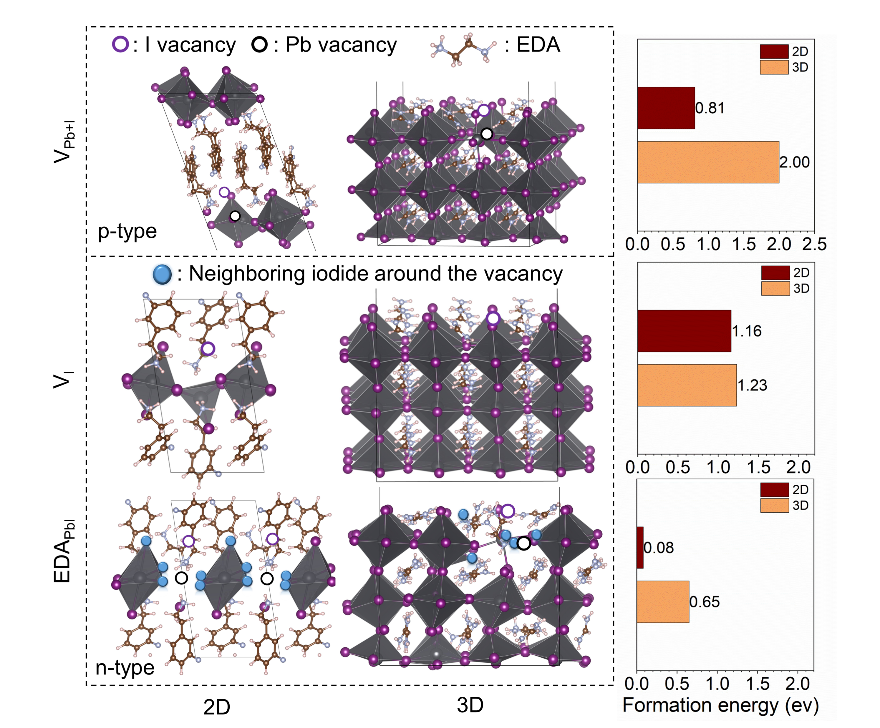 为了理解分子掺杂机制,研究人员采用第一性原理计算了乙二铵离子的掺杂结构,揭示了乙二铵阳离子可以替换Pb+I两个位置的离子,造成n型掺杂;而对于基于苯乙铵的二维结构钙钛矿,形成Pb+I空位缺陷的形成能大幅降低,导致形成p型掺杂(图2)。分子掺杂带来的多位点离子替换为薄膜的电学掺杂提供了解释。