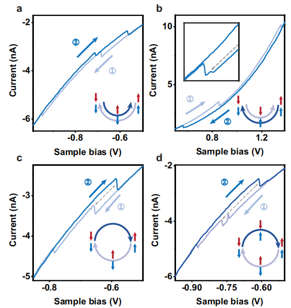 通过利用导电原子力显微镜,他们精细测量了铁电和反铁电区域的隧穿曲线,发现了有趣的铁电极化逐层反转的特性。如图二所示,研究者确定了极化翻转的路径,同时也实现了器件在三个或四个阻值之间的切换。