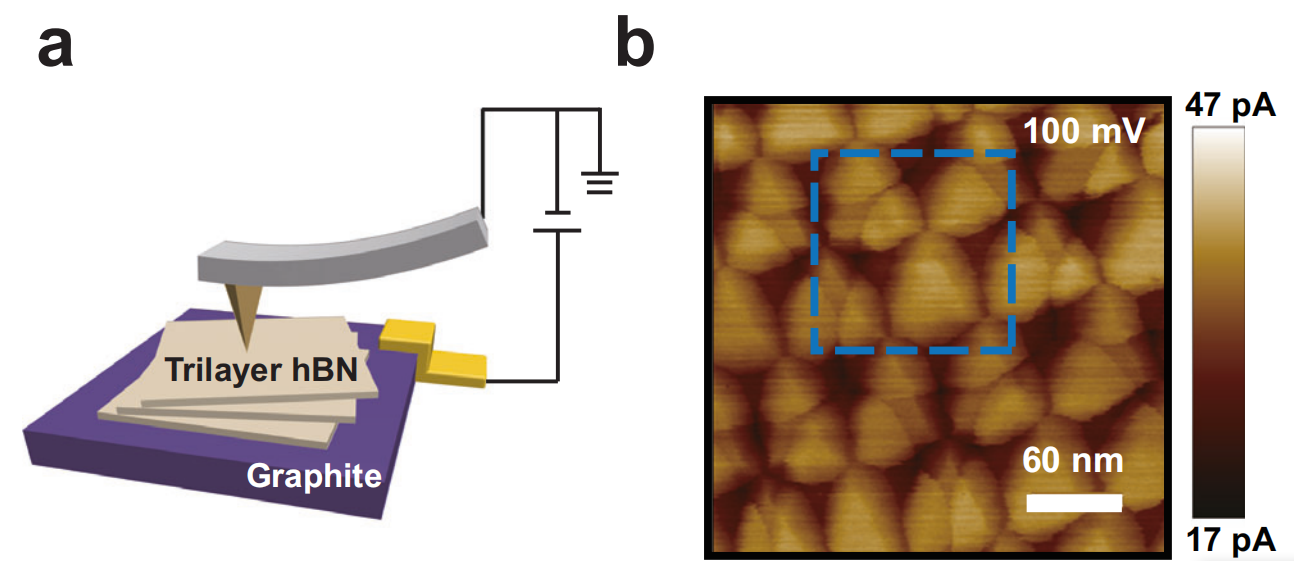 铁电的研究已有百年历史。近年来低维铁电体系蓬勃发展,为铁电家族引入了新的成员。其中的二维铁电绝缘体天然地适合制备成铁电隧穿结,对其进行研究将推进相关基础科学和应用技术的发展。薛加民课题组和合作者在前期工作的基础上(Advanced Materials 34, 2203990 (2022)),制备了基于三个原子层厚的氮化硼铁电器件,如图一a所示。由于层间转角,他们发现在器件中同时出现了面外铁电和反铁电的畴(图一b)。