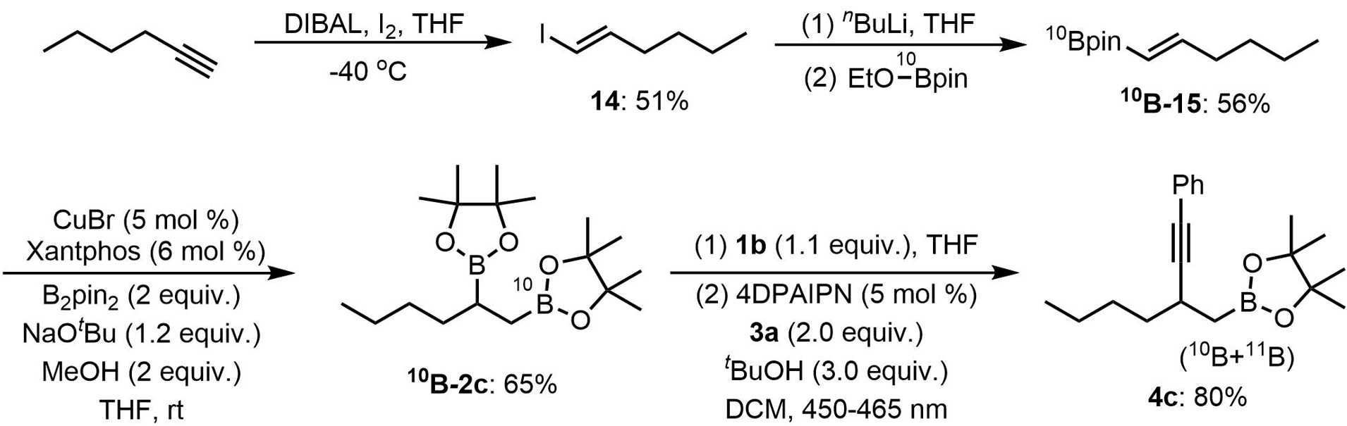 为了探索反应机理,通过1-己炔的氢碘化反应制备化合物14,然后14发生锂卤交换,进而与10BpinOEt反应,很容易制备10B标记的反式烯基硼酸酯15。化合物15发生铜催化的硼化质子化反应,以65%的收率制备端位10B标记的化合物2c。将10B-2c置于标准反应条件下,能够以80%的分离收率得到炔基化产物4c(图2)。