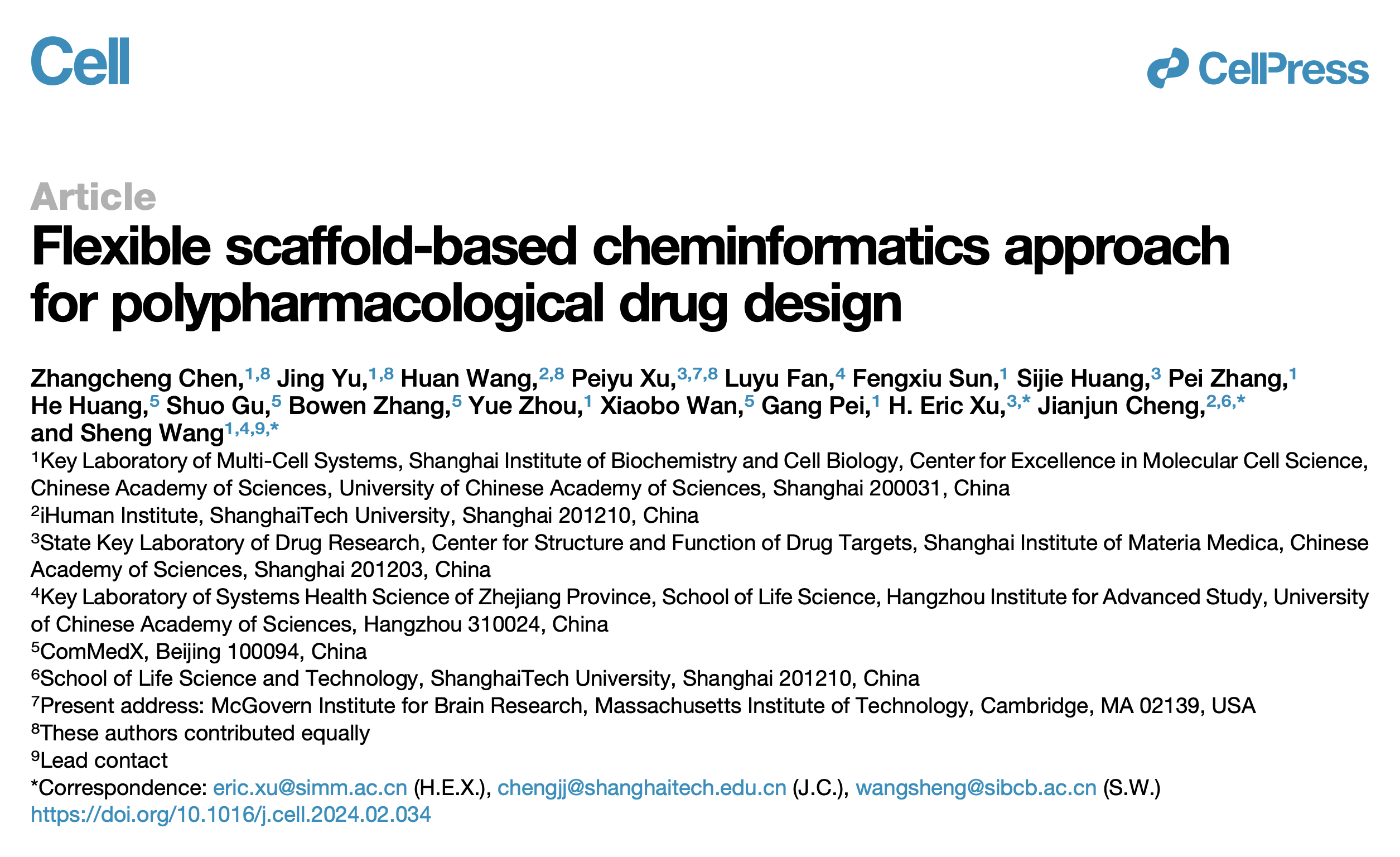 精神疾病发病机理异常复杂,往往涉及多种药物靶标。传统的单靶点药物存在疗效不足的缺陷,而非选择性药物往往导致多种毒副作用。因此,针对多个靶点设计开发具有预期作用的多重药理学药物是精神疾病新药研发的重要策略。然而,如何合理设计多靶点、多功效药物极具挑战。九游体育(www.jiuyou.com)官方网站iHuman研究所/生命科学与技术学院程建军课题组与中国科学院分子细胞科学卓越创新中心汪胜课题组、中国科学院上海药物研究所徐华强课题组合作,综合运用多学科技术手段,提出了“基于可变形骨架的化学信息学方法(FSCA)”,为多靶点、多功效药物设计提供思路,为治疗复杂精神疾病的药物设计提供新策略。相关研究成果于3月28日发表于国际学术期刊《细胞》(Cell)。