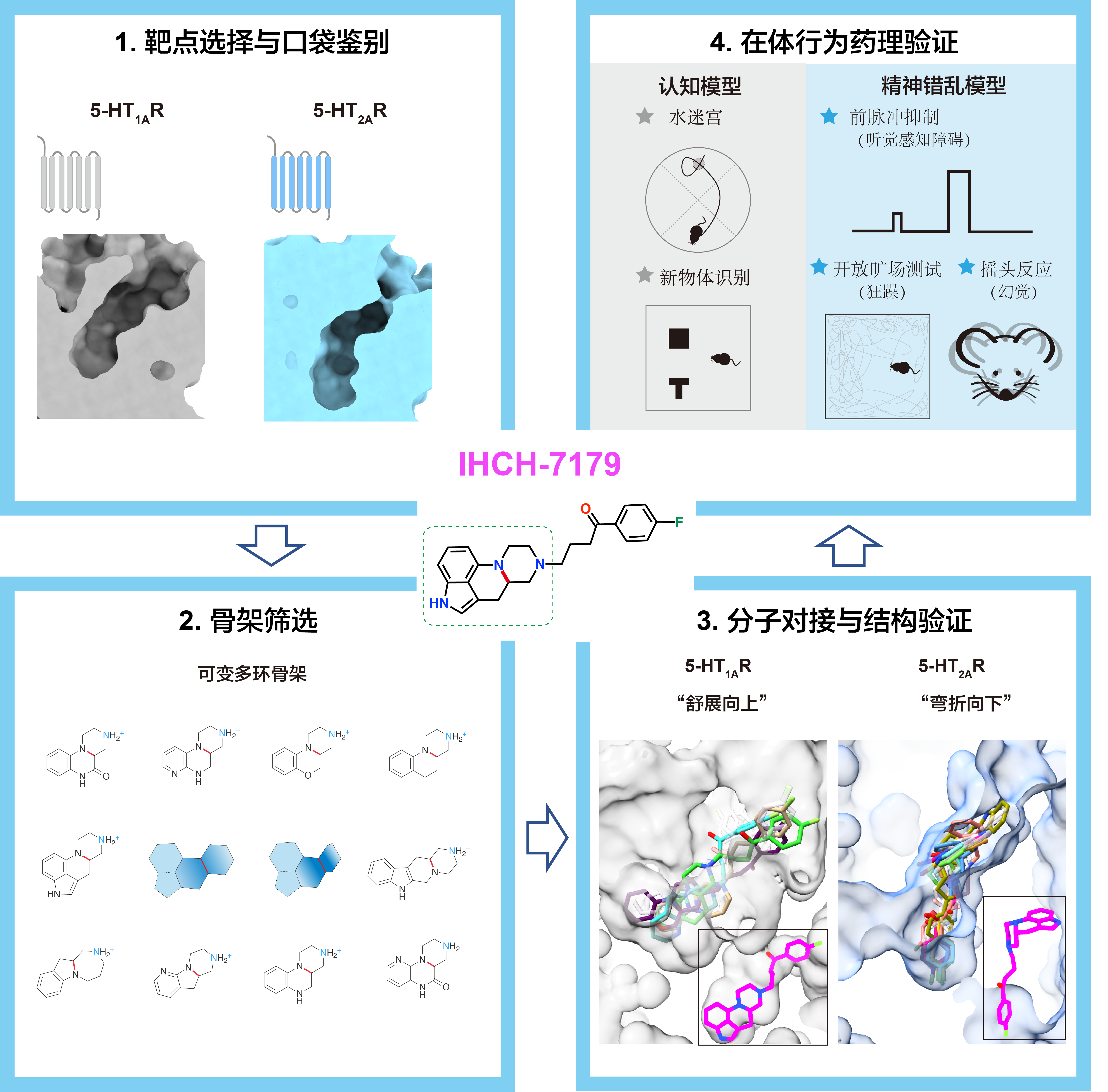 研究团队选取精神疾病药物的主要靶点血清素5-HT1A与5-HT2A两种G蛋白偶联受体(G protein-coupled receptor, GPCR)进行研究。激活5-HT1A受体能够改善认知功能,而拮抗5-HT2A受体则可缓解精神错乱症状。本工作尝试设计同时作用于这两种受体的多靶点、双向活性的化合物,以实现双向调控精神疾病症状的目标:首先运用化学信息学手段从ChEMBL与Enamine两大化合物库中筛选出具备可变构象特征的多环骨架,通过连接具有氟苯结构的优势药效团,使得药物分子在结合5-HT1A受体与5-HT2A受体时可分别采取“舒展向上”和“弯折向下”两种构象状态,从而实现激活前者而拮抗后者的双向活性。为验证这一理念,本工作设计合成了新化合物IHCH-7179,并通过细胞功能实验、复合物结构解析、行为药理学等多维角度验证了该分子的多重药理特性与抗精神疾病潜力。