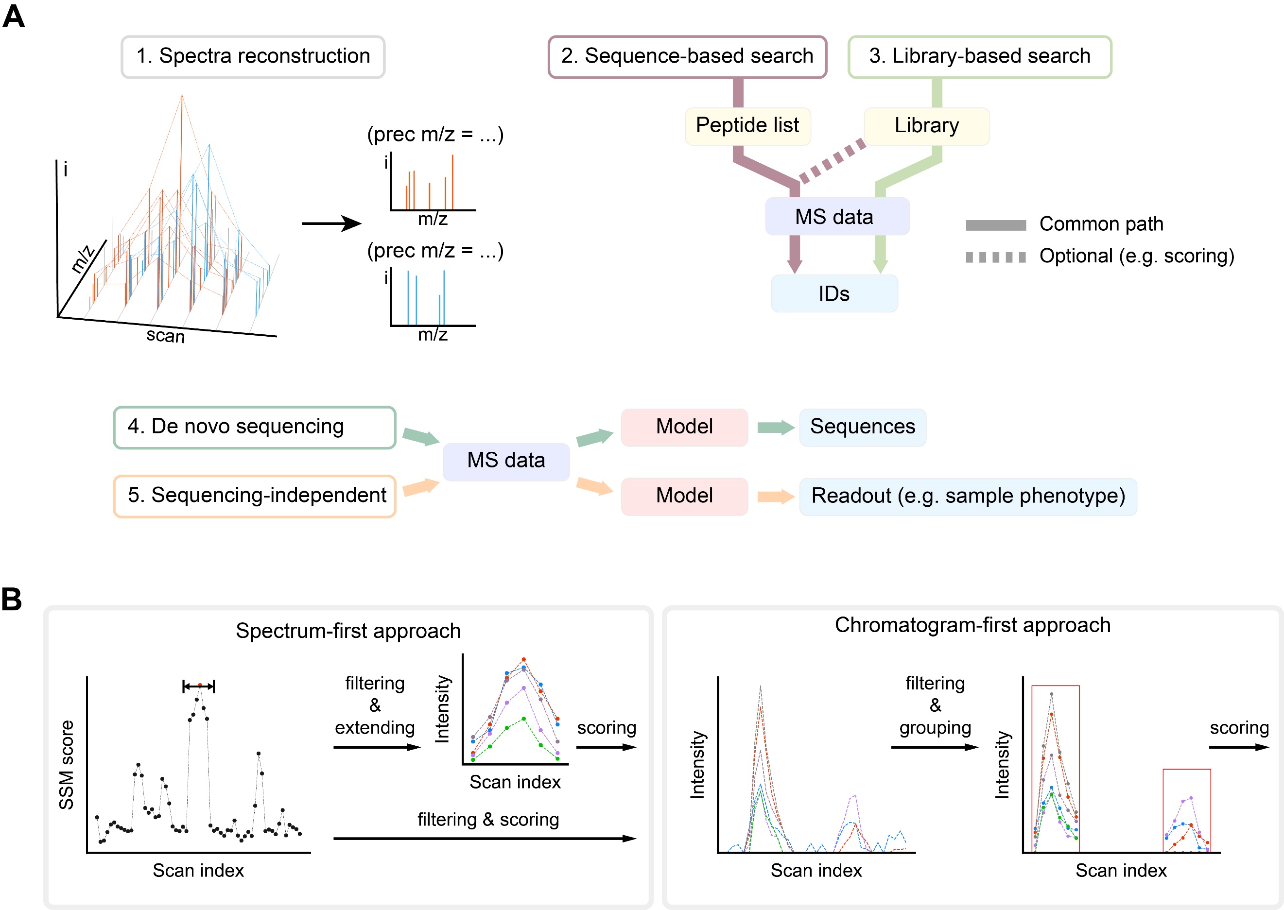 图2. 从DIA数据中获得不同信息的方式(A)和两种组合信号的方式(B)